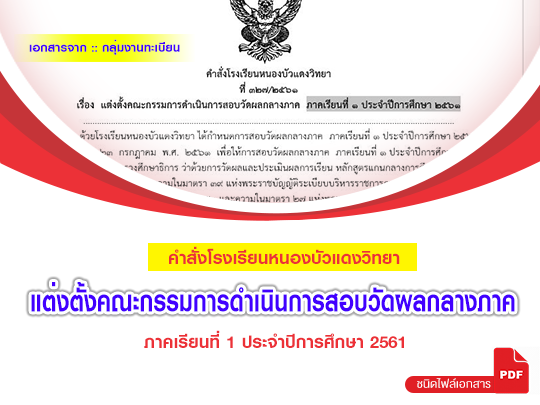 คำสั่งโรงเรียนหนองบัวแดงวิทยาเรื่อง แต่งตั้งคณะกรรมการดำเนินการสอบวัดผลกลางภาค ภาคเรียนที่ 1 ประจำปีการศึกษา 2561