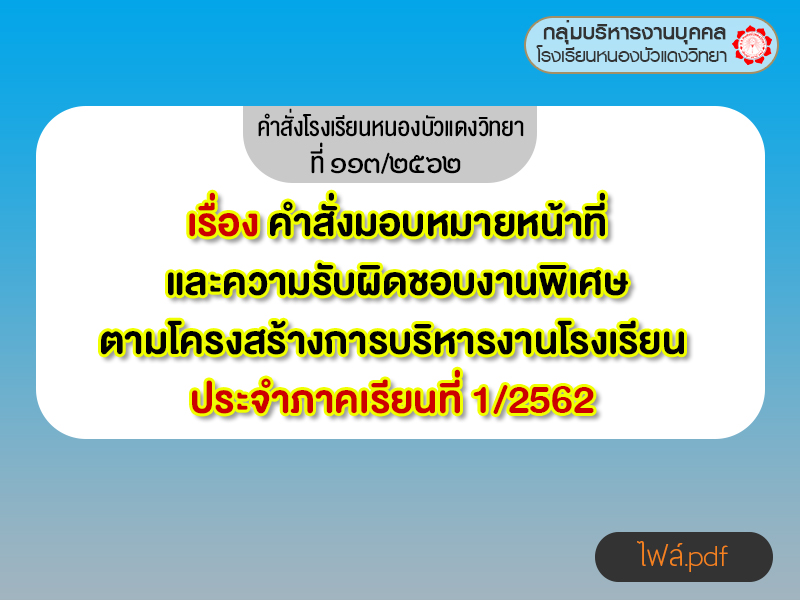 คำสั่งมอบหมายหน้าที่และความรับผิดชอบงานพิเศษตามโครงสร้างการบริหารงานโรงเรียน ประจำภาคเรียนที่ 1/2562
