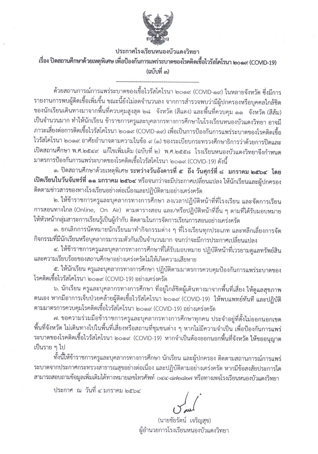 ประกาศโรงเรียนหนองบัวแดงวิประกาศโรงเรียนหนองบัวแดงวิทยา เรื่อง ปิดสถานศึกษาด้วยเหตุพิเศษ ฉบับที่ 3