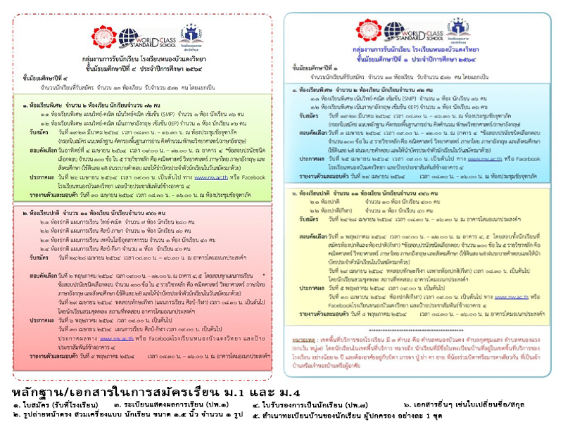 ปฏิทินการรับสมัครนักเรียนชั้นมัธยมศึกษาปีที่ 1 และมัธยมศึกษาปีที่ 4 พร้อมด้วยเอกสารรับสมัคร