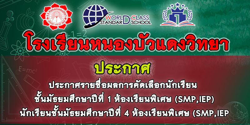 โรงเรียนหนองบัวแดงวิทยา ประกาศรายชื่อผลการคัดเลือกนักเรียนชั้นมัธยมศึกษาปีที่ 1 ห้องเรียนพิเศษ (SMP,IEP)นักเรียนชั้นมัธยมศึกษาปีที่ 4 ห้องเรียนพิเศษ (SMP,IEP) |