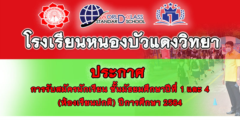 ประกาศโรงเรียนหนองบัวแดงวิทยา เรื่อง การรับนักเรียนชั้นมัธยมศึกษาปีที่ 1 และชั้นมัธยมศึกษาปีที่ 4 (ห้องปกติ) ปีการศึกษา 2564