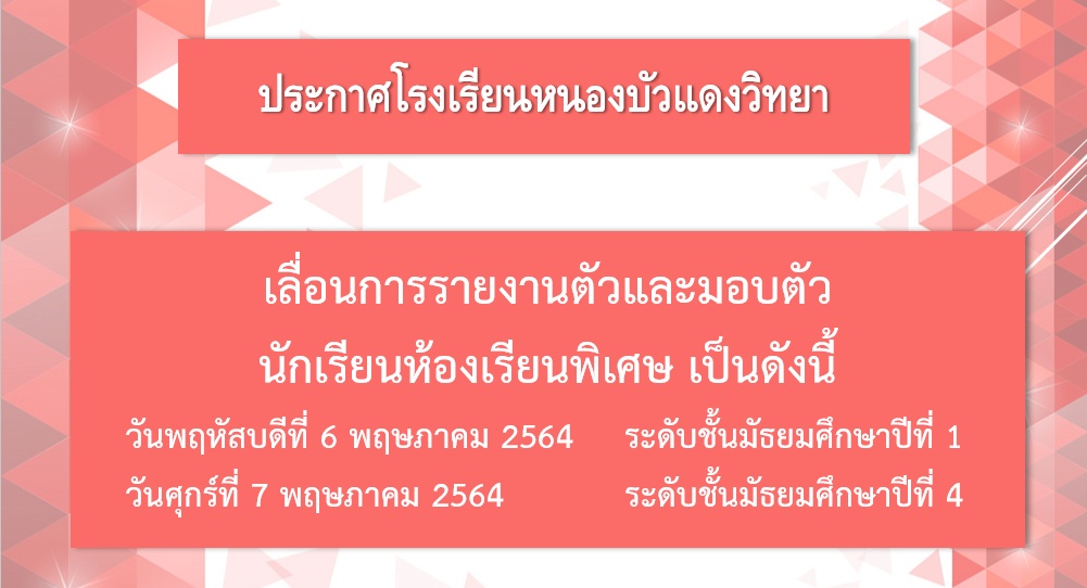 ประกาศโรงเรียนหนองบัวแดงวิทยา เรื่องการเลื่อนรายงานตัวและมอบตัว ม.1 และ ม.4 ห้องเรียนพิเศษ (SMP,IEP)