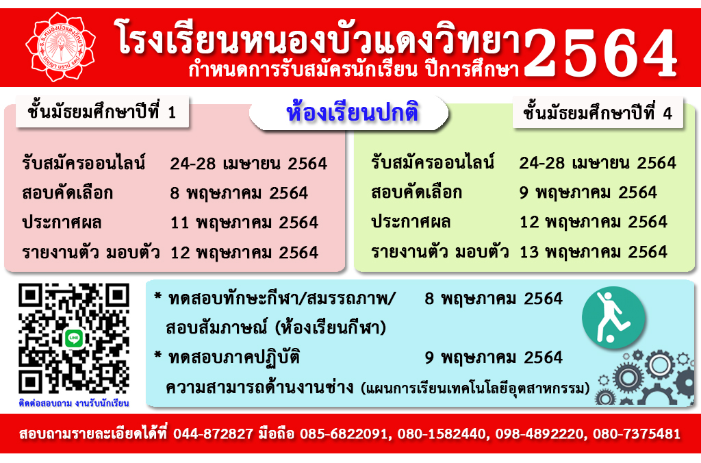 ประกาศโรงเรียนหนองบัวแดงวิทยา เรื่องการรับนักเรียน ชั้นมัธยมศึกษาปีที่ 1 และมัธยมศึกษาปีที่ 4 ปีการศึกษา 2564 (แก้ไขปรับปรุง ฉบับที่ 1)